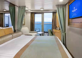 这些豪华客舱拥有落地窗,可俯瞰私人阳台,自然光充盈室内。客舱内设休息区,两张下铺床可转换为一张特大号床——即我们标志性的Mariner\'s Dream™床,配有豪华欧式顶垫床垫,并配备带高端按摩花洒的淋浴设施。